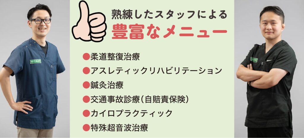 スポーツ外傷から鍼治療、骨盤矯正まで幅広い治療があり様々な症状に対応していますのでお気軽にご相談ください。