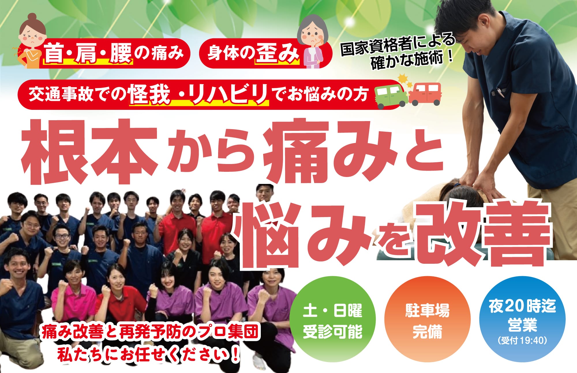 各店ともに土曜日、日曜日も営業、駐車場完備、夜20 時まで営業(受付19:40迄)しており、通いやすい接骨院です。