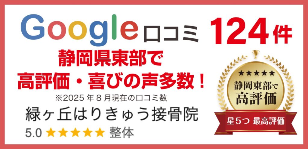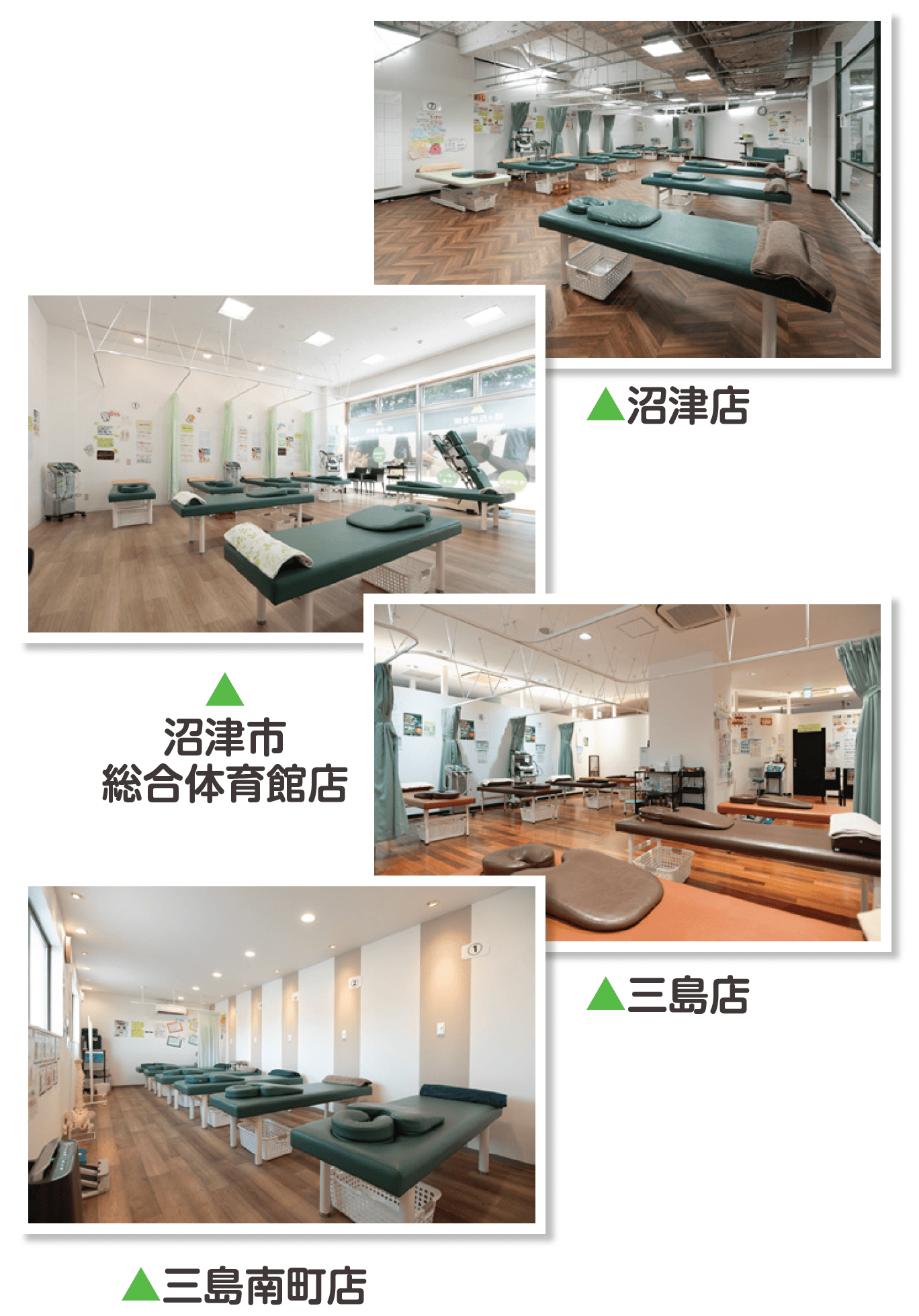 緑ヶ丘接骨院は、沼津市に2 店舗、三島市に2 店舗、治療院を構えております。