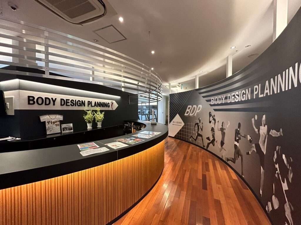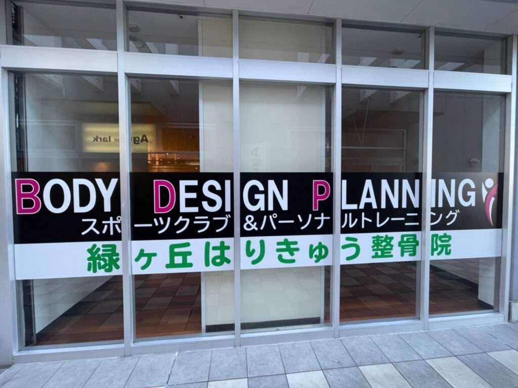 店舗外観には、当院とBODY DISIGN PLANNING(スポーツジム)の店名を大きく掲出しております。