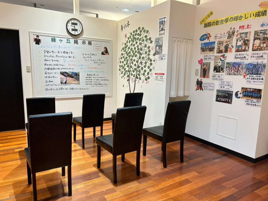患者様が診察や治療の前に待つ場所となります。当院の最新情報の掲示や患者様のスポーツや活動の輝かしい成績なども紹介しておりますので、ぜひご覧になってください。