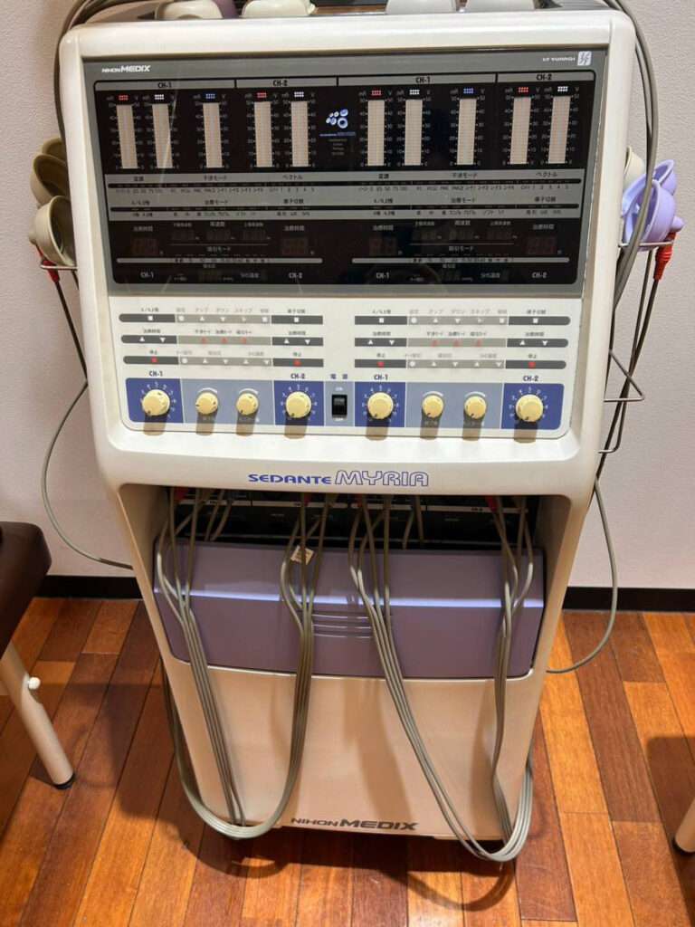 痛みの原因となる深部組織に高圧電流(250V)を刺激することで、消炎・鎮痛を行い、治癒力を促進することができます。この治療法は、急性の痛み(寝違いやギックリ腰、捻挫や打撲)や、長引く痛みやシビレなどの慢性症状に対して効果が期待できます。