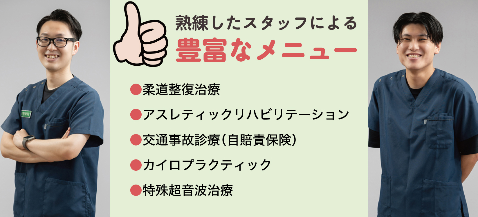 スポーツ外傷から骨盤矯正まで幅広い治療があり様々な症状に対応していますのでお気軽にご相談ください。