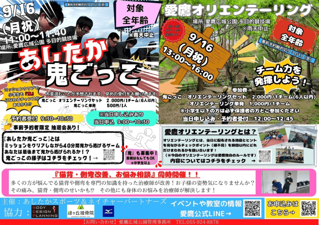 9/16(月祝)に多目的競技場で【あしたか鬼ごっこ】【愛鷹オリエンテーリング】を開催します。