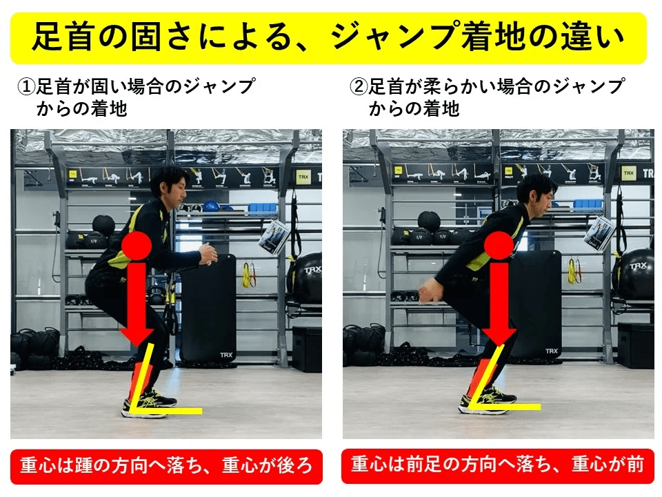 上記の写真は、ジャンプからの着地動作に足首の固さでどのような事が起こるのかを現した写真です。